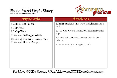 Today’s Goode & Gooseberry Project Recipe is Rhode Island Peach Slump (using Gooseberry Patch’s Cinnamon Biscuits as a part of the recipe! Double score!) … and DUDE this stuff is GOODe!