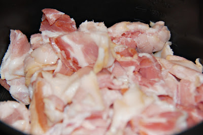 Start by cutting up 2 lbs of bacon in your handy-dandy microcooker… or just fry it up and crumble it up afterward…