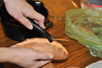This is SUPER simple…start by peeling your sweet potatoes with your sister’s new Pampered Chef Peeler.
