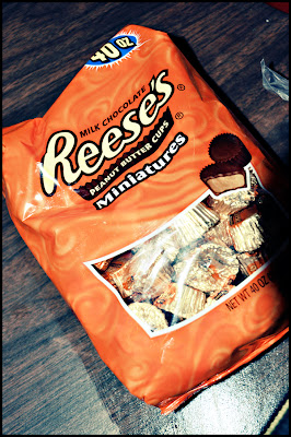 Stick one Reese Cup in the center of each cupcake until it is even with the batter.