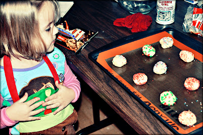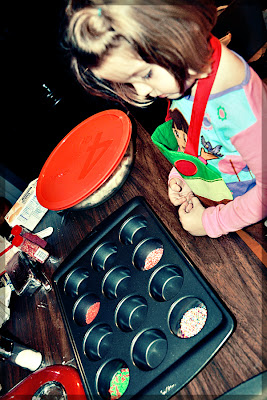 Lil Monkey is adorable! And those cookies are cute, too. I love the idea of putting sprinkles in muffin tins. I might have to steal that for myself, in spite of the fact I don't have any littles around to bake with!