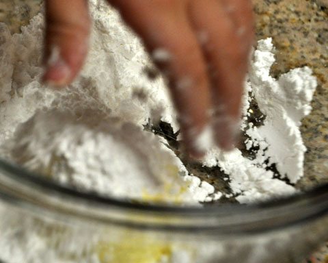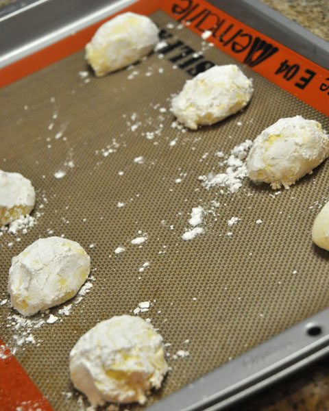 Then scoop out tablespoon scoops and drop into a bowl of powdered sugar.