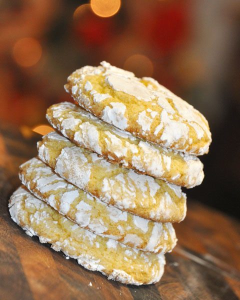 The Santa Cookie recipe from Gooseberry Patch’s Christmas in the Country is very similar to the recipe he used… except he used Butter Pecan cake mix and nixed the white chocolate chips.