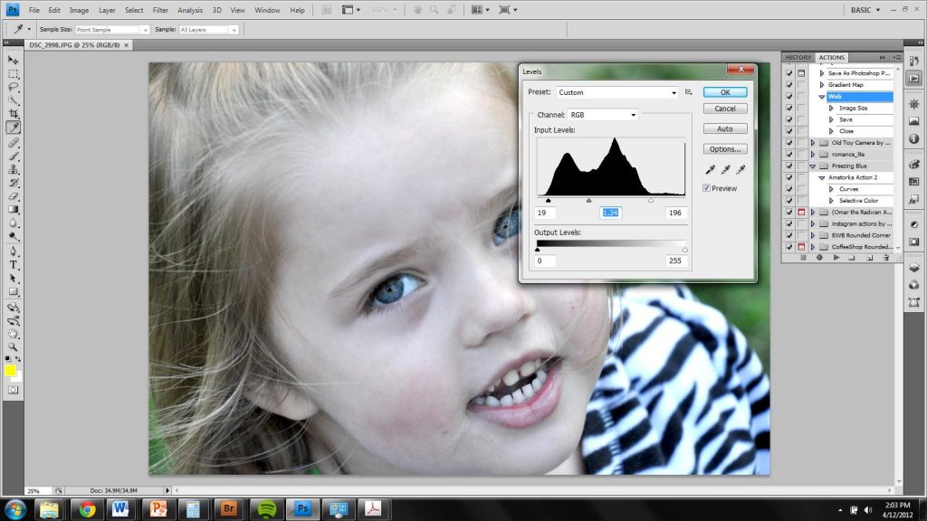 4. Leave the middle triangle alone unless you need to brighten or darken the mid-tones in the image to prep it for an action. When using one of my favorite actions, I usually have to lighten my midpoints up quite a bit to achieve the look I am going for. You lighten your mid-tones by moving the middle triangle to the left (in this case to 1.34).