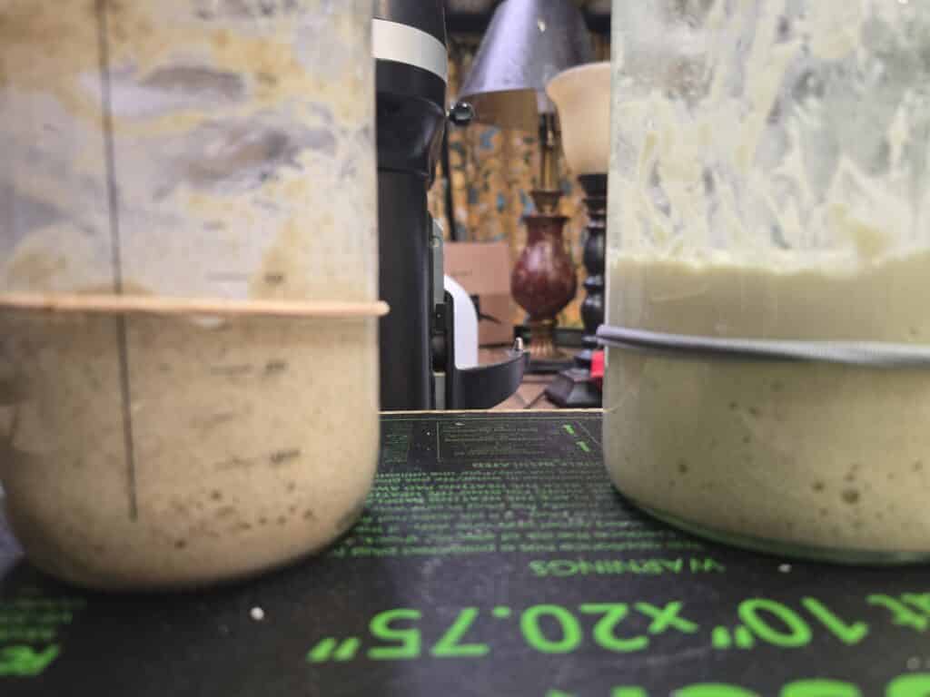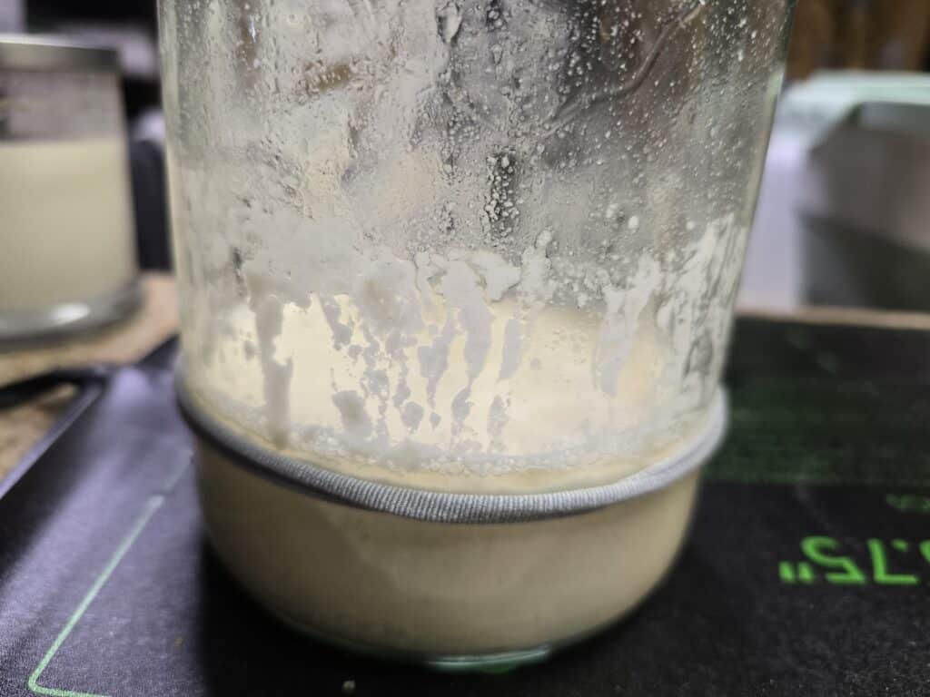 The rye flour sticks to the sides of the jar.