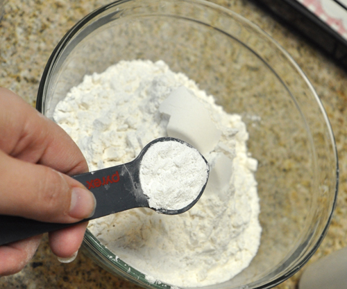Meanwhile combine your dry ingredients in a separate bowl– 3 cups Flour and 2 t Baking Powder.