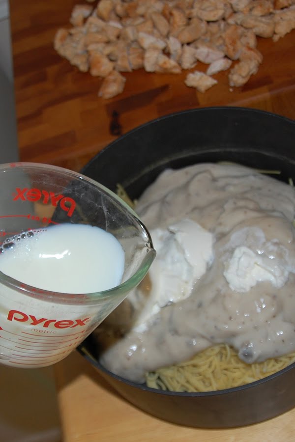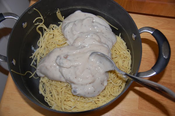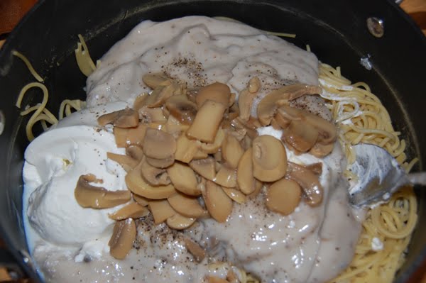 Then I added a couple cans of mushroom soup to my drained pasta