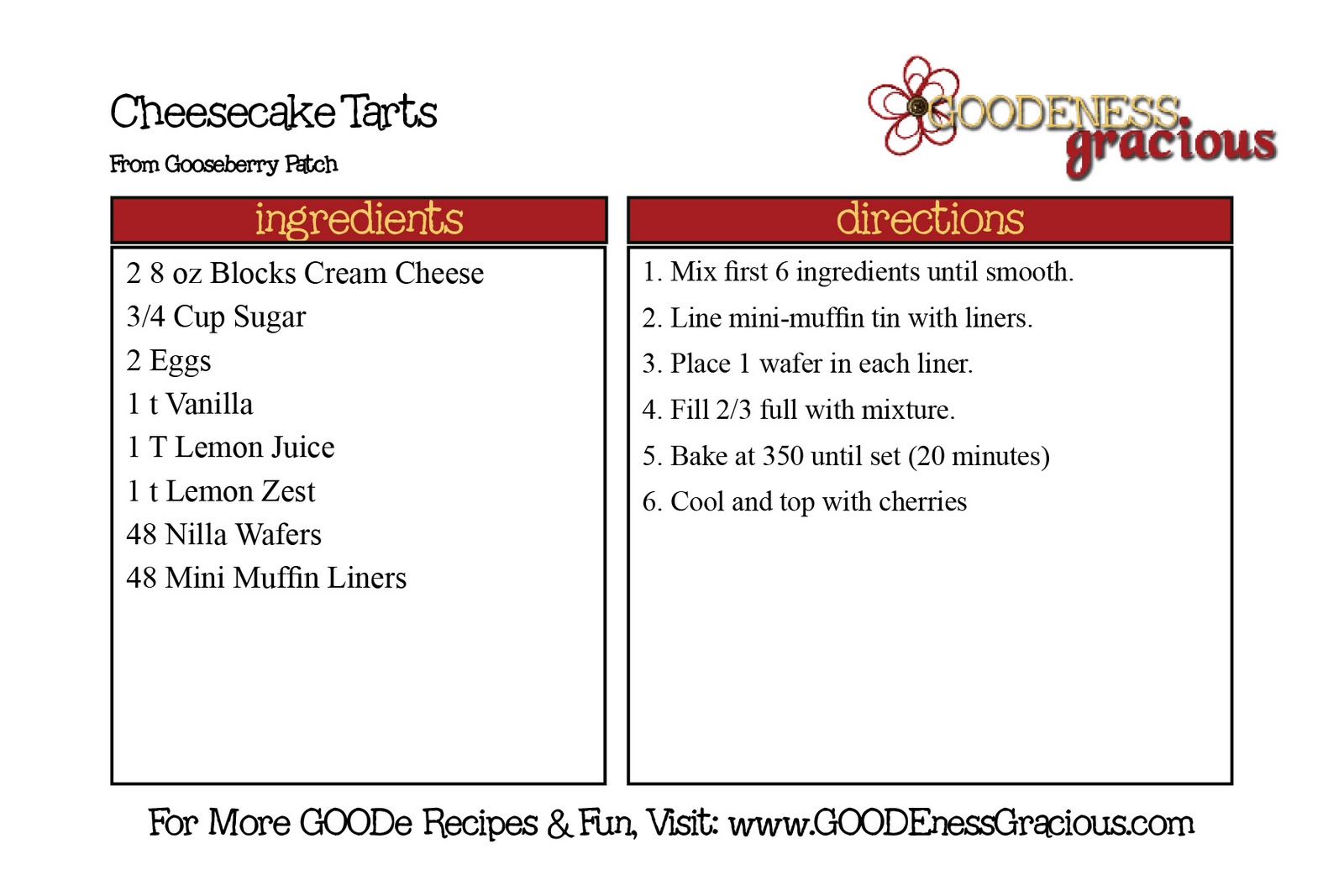 Tonight’s Goode & Gooseberry Patch Project Recipe: Cheesecake Tarts is PERFECT for all those holiday get togethers… bite size portions and a super quick–easy peasy recipe!