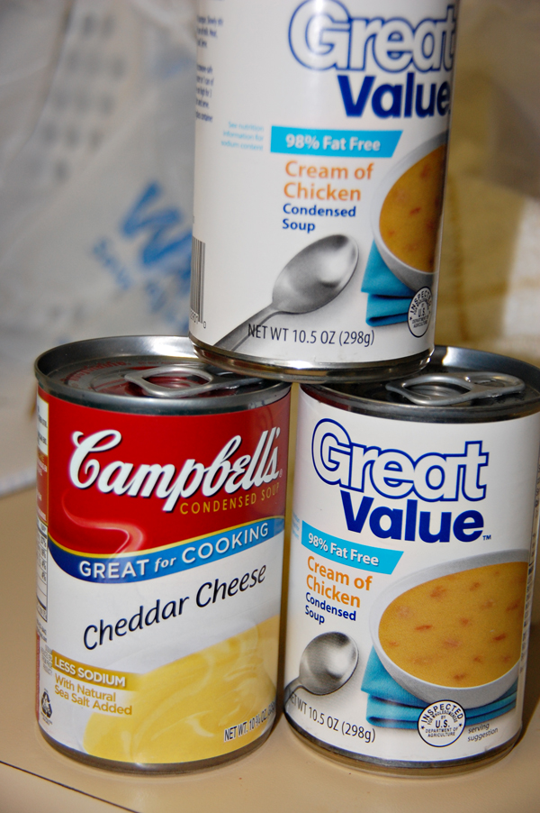 Then pour in 2 cans of Cream of Chicken Soup and 1 can Cheddar Soup on top