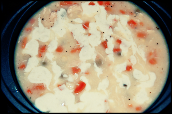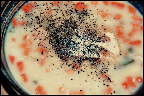 We started out with a can of chicken breast. Now, next time I will likely use my new micro-cooker to whip up some frozen chicken breast in a flash, but like I said I was feeling under the weather so I really appreciated that I could just open cans and have Miss Add dump them in (and this was pre-micro-cooker… aka the tool that is changing my life…lol ;)).