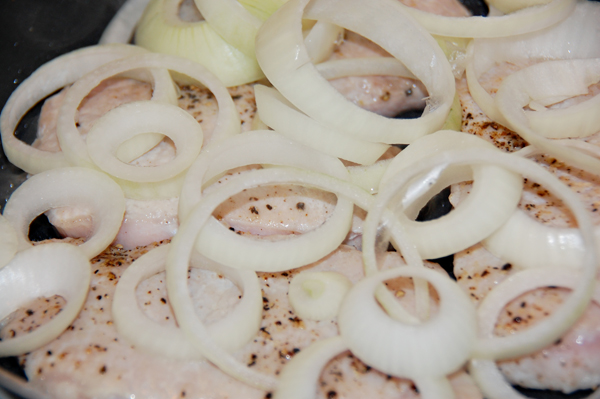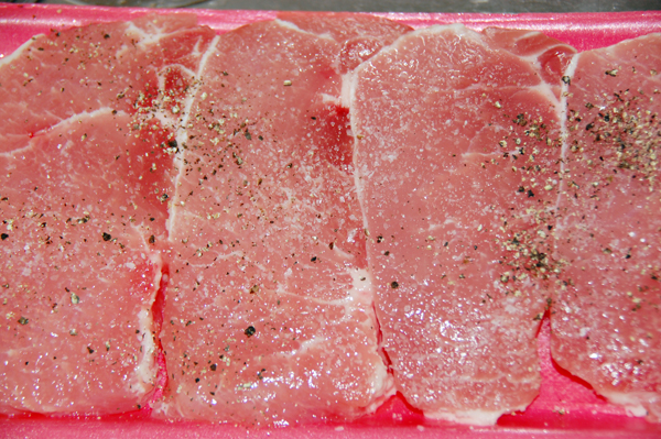 Start by putting a little oil in a skillet and brown up your boneless chops