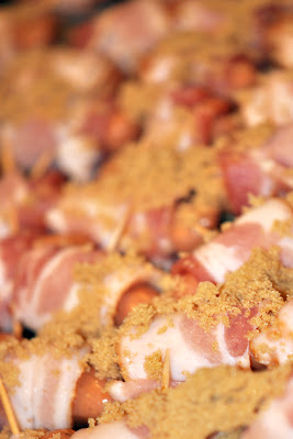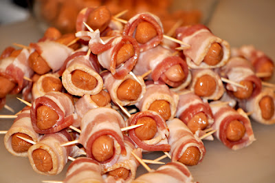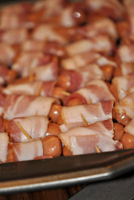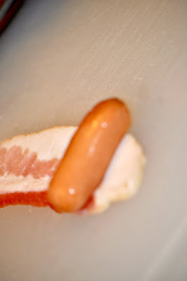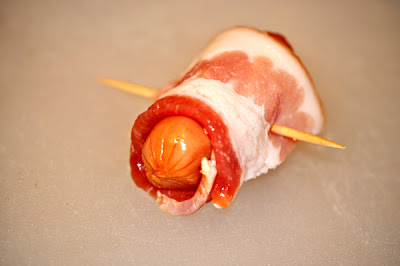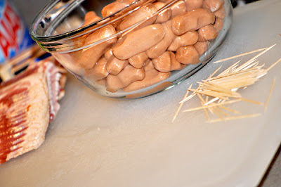 Now create your assembly line. Dump out some toothpicks, put your weenies in a bowl and line up your bacon.