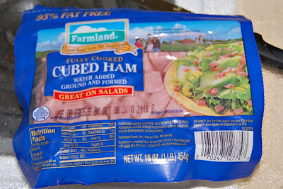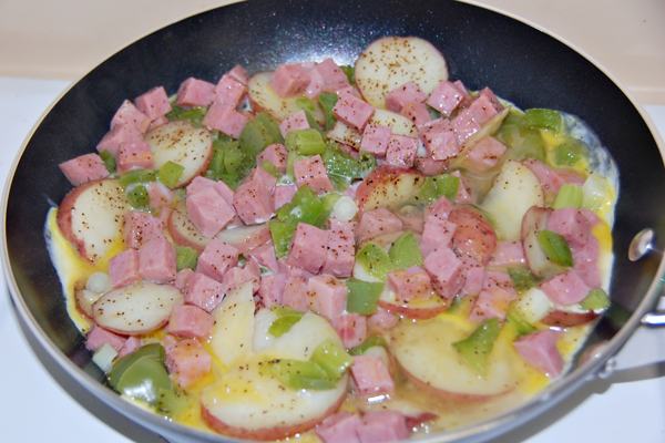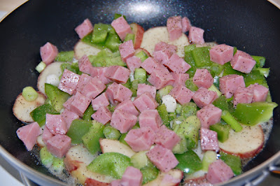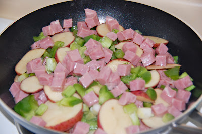 And tossed half of the onions in the skillet with 1 cup of ham cubes.