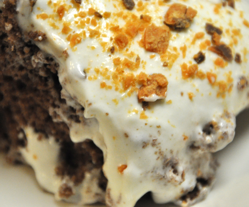 Very much an appropriate name. Holy yumminess batman! This dessert is the perfect marriage of all my favorite sweets… My favorite candy bar: Butterfinger… My favorite cake: Chocolate… My favorite milk: Sweetened Condensed Milk ;)… My favorite ingredient of all time: Cream Cheese… Oh and did I mention there was caramel in it too… This baby is sweet… and delish! Recipe coming soon.