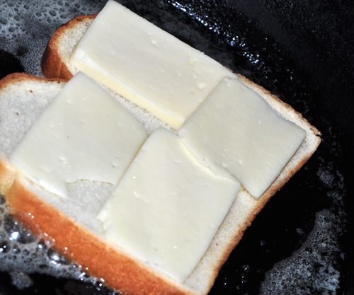 Placed a slice of bread down on the butter and sliced up some Havarti cheese.