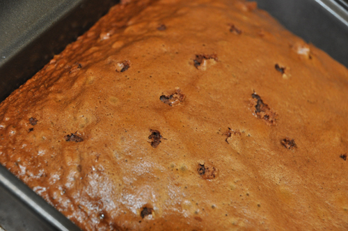 3. Poke holes in hot cake and pour caramel/milk mixture over top and sprinkle half of candy bar on top.