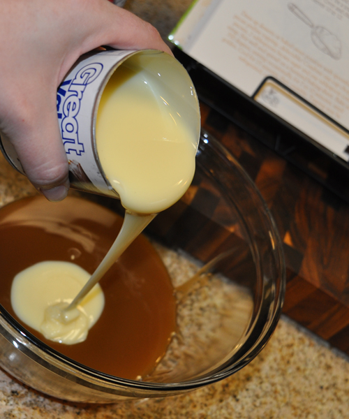 Meanwhile, combine 1 jar of caramel sauce and 1 can of sweetened condensed milk.