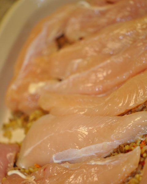 I then placed 12 Chicken Tenderloins on top of the rice. I like to use Tenders or Thinly Sliced Chicken Breast instead of regular Chicken Breasts in casseroles where the chicken lays on top. The dishes seem to cook more evenly that way…
