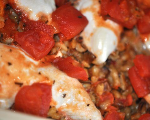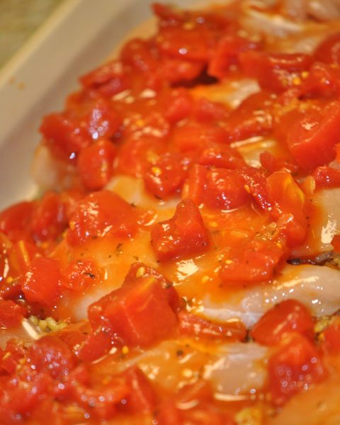 I then poured my tomatoes on top and popped in the oven at 350 for 30 minutes covered (now I reduced my time because I was using a smaller cut of chicken– Full Chicken Breasts will take closer to an hour).