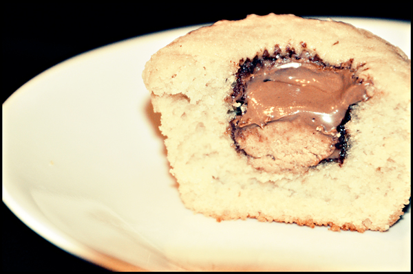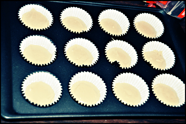 Stick one Reese Cup in the center of each cupcake until it is even with the batter.