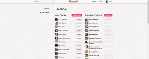 Pinterest makes it easy to find your friends by connecting to Facebook and Twitter. (Click the menu under your name, then choose “Find Friends”)