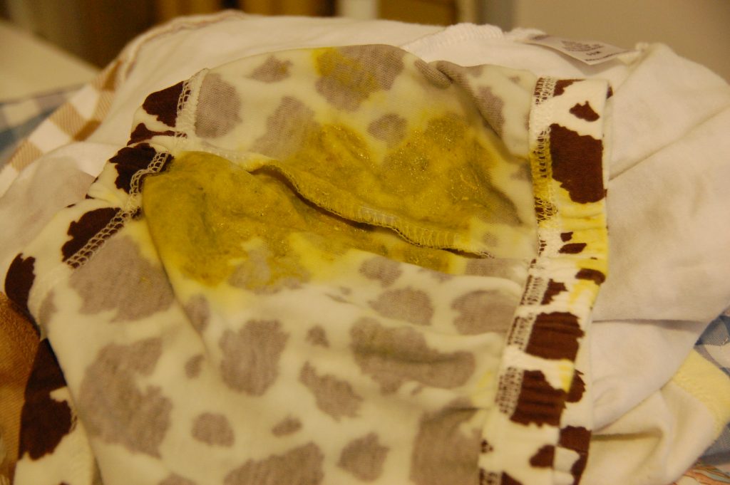 While this is completely normal I am told, it does make things a bit messy from time to time. If the diaper isn’t on tight enough or if he is sitting a certain way or whatever may be, what is supposed to stay in the diaper does not and ends up on his clothes, my clothes, blankets…well, just about anything and everything.