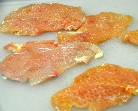 Then take 1 lb of chicken and pound it 1/4 inch thin.