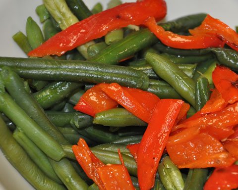 - Steam green beans then add peppers once they are peeled and cut into strips.