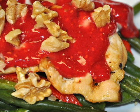 - Top chicken with raspberry sauce and sprinkle walnuts on top.
