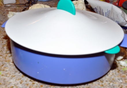 Let it steam for about 8 minutes on high. In the meantime, get your pasta cooking. Tonight it is the mini bowties because it cooks fast. I might smash a garlic clove and toss it in the water with the pasta. Might.