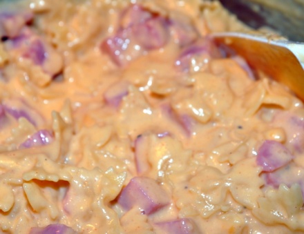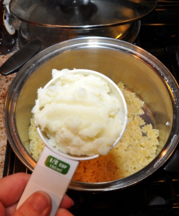 When the pasta is done, drain and return to the same pan. Add ½ cup of the puree.