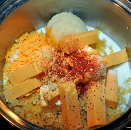 Add 1 cup of cubed velveeta, a fist full of chedder, 1/3 of a cream cheese block, and ½ cup of milk. Sprinkle with salt, pepper, and paprika.