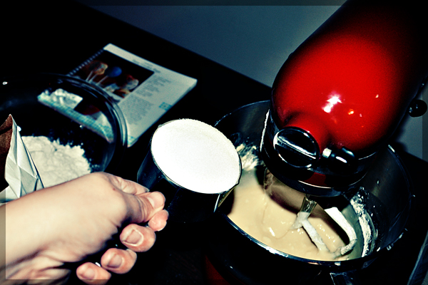 I would bore you with the pics, but they all look very similar… you dump a bunch of white stuff –albeit important white stuff– into the other white stuff… the flour.
